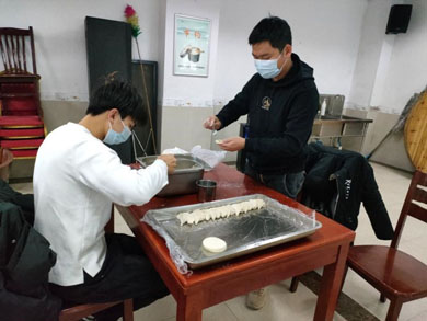 食堂工作人员一早就开始忙碌,洗菜切菜,放料调馅,终于准备好白菜猪肉馅。吃过午饭,员工就开始行动起来啦!大家开始分发馅料、饺子皮、餐盘,会包饺子的工作人员早早就位,向其他人炫耀起自己包的饺子。“你要向我这样,蘸点水,双手一捏就好啦!”不会包饺子的工作人员只好虚心求教。大家用自己拿手的方式包着各式各样的饺子,有说有笑,互相切磋包饺子的技巧,彼此比较着饺子的形状,包饺子的速度,忙的不亦乐乎。在大家共同的努力下,餐盘里很快就出现了一个个“圆鼓鼓的大白胖”,当然也免不了有一些形状奇特的新手作品。